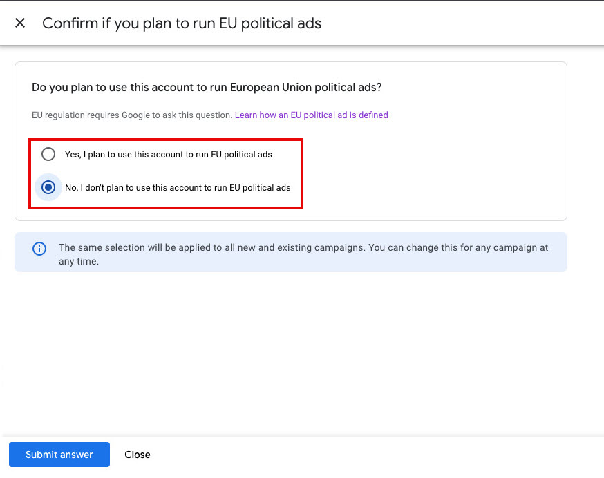 براساس این قانون، برای هر حساب تبلیغاتی یا کمپین، باید اعلام شود که آیا «تبلیغ سیاسی در اتحادیه اروپا» دارید یا خیر. اگر شما در حساب گوگل ادزتان پیام «Plan to run EU political ads? Confirm…» می‌بینید، یعنی گوگل از شما می‌خواهد که این وضعیت را مشخص کنید.
