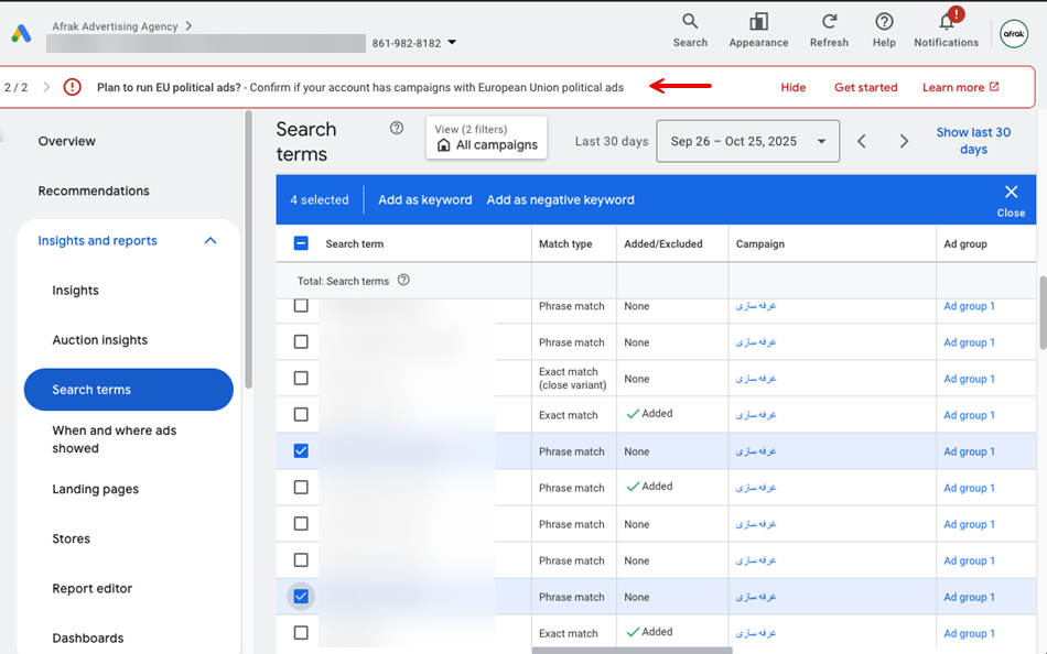 پیغام جدید گوگل ادز درباره تبلیغات سیاسی اتحادیه اروپا به اجرای قانون جدید این اتحادیه برای شفافیت در تبلیغات برمی‌گردد. هدف از این قانون جلوگیری از سوءاستفاده‌های سیاسی و حفظ شفافیت در تبلیغات آنلاین است. بنابراین اگر تبلیغی در حوزه سیاسی ندارید، فقط کافی است گزینه «خیر» را انتخاب کنید تا کمپین‌های شما بدون محدودیت ادامه پیدا کنند.