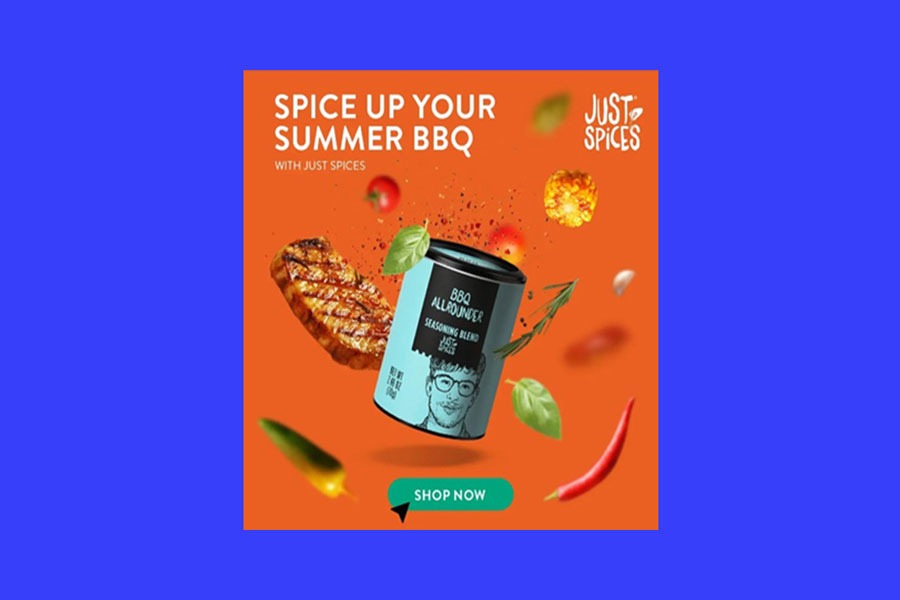برند Just Spices بهدلیل تصویر محرک و کال تو اکشن (CTA) مستقیم، در فهرست بهترین نمونههای تبلیغات نمایشی گوگل قرار دارد. تبلیغات Jyst Spices، علاقهمندان به غذا را با تصویر محصولات تازه و یک استیک کبابیشده، هدف قرار میدهد؛ این تصویر بهقدری وسوسهانگیز است که مخاطب، خودش را در حال خوردن استیک تصور میکند.